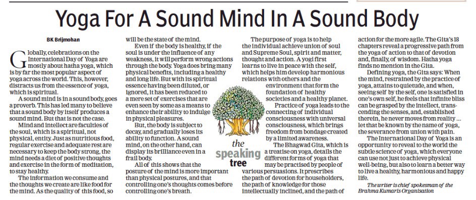 Yoga for a Sound Mind in a Sound Body - Article by Br Brij Mohan published in the Times of India Speaking Tree