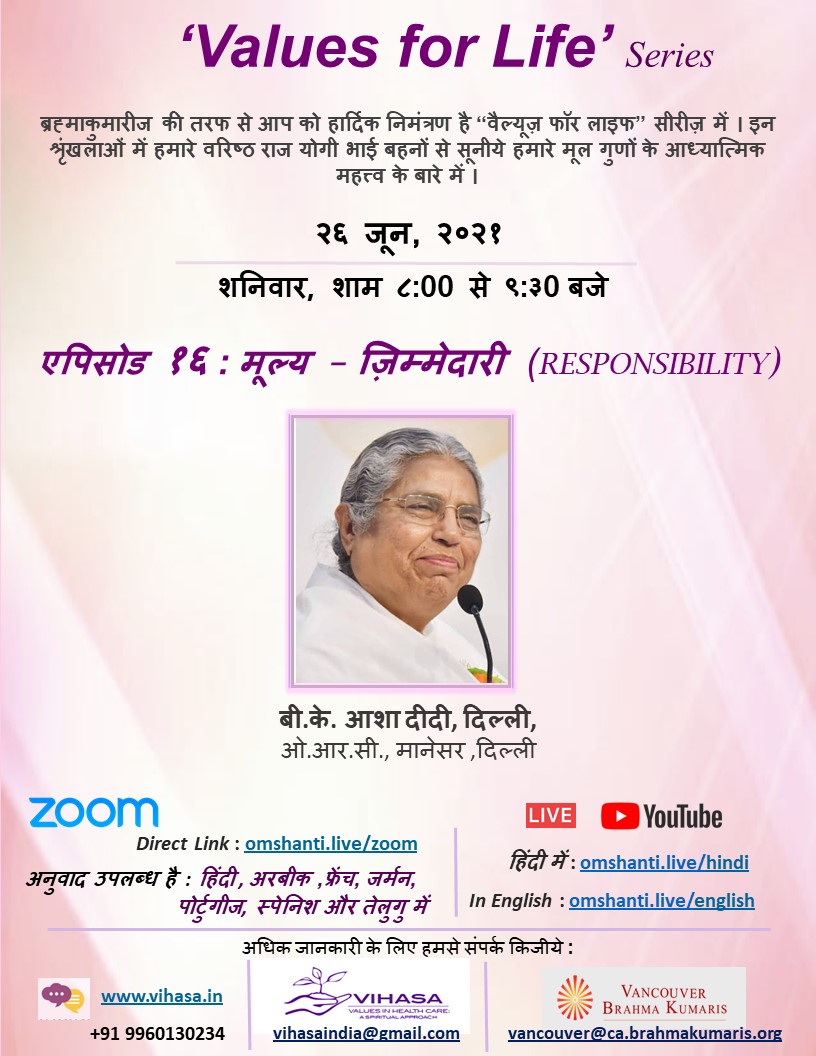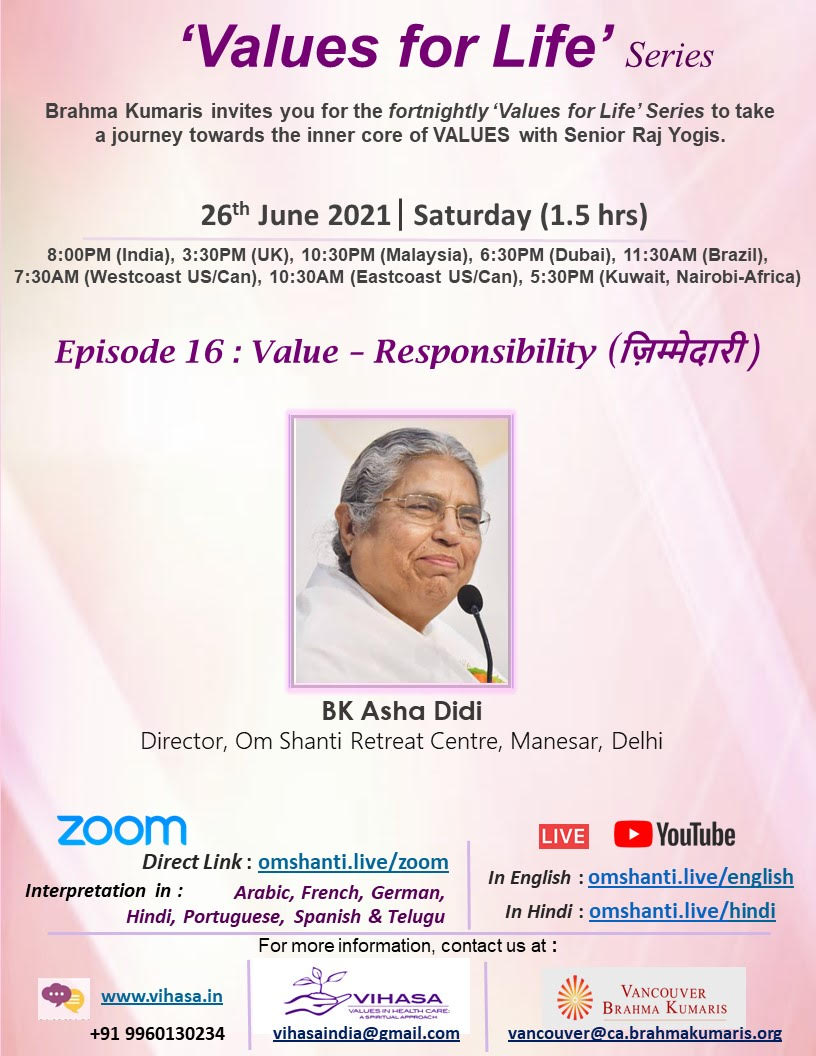 Warm invitation for Ep 16, 'Values for Life' Series, with BK Asha Didi, on RESPONSIBILITY on 26th June