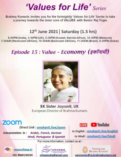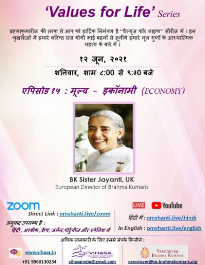 आप को हमारा हार्दिक निमंत्रण है ‘ Values for Life’ Series के एपिसोड १५ में, १२ जून को शाम ८:00 बजे । इसमें यू के से हमसे जुड़ेंगे जयंती दीदी जी, और हमसे आध्यात्मिक ऊर्जा - “ इकॉनामी ” कि महत्व पर चर्चा करेंगे।