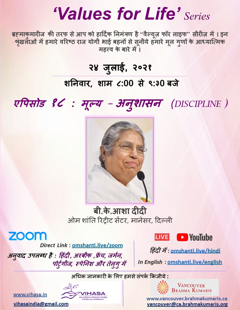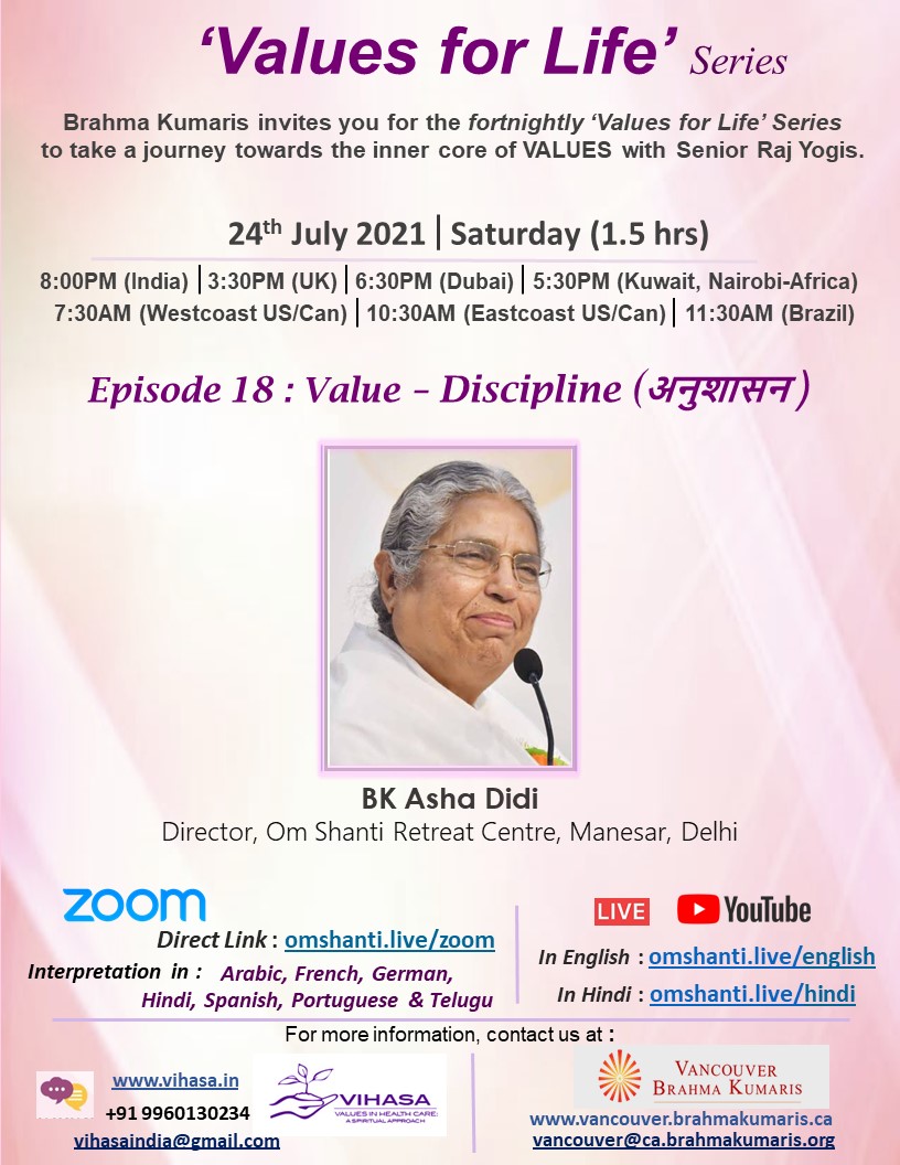We extend our warm invitation for Episode # 18 of our fortnightly 'Values for Life' Series, with BK Asha Didi, for a spiritual reflection on “DISCIPLINE”.