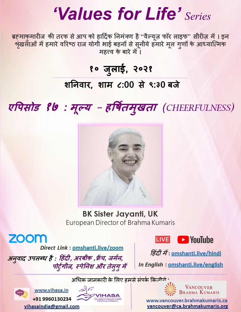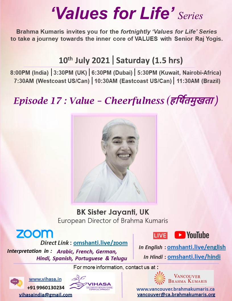 A Warm invitation for Ep 17, 'Values for Life' Series, with BK Sister Jayanti, on 'CHEERFULNESS' on 10th July