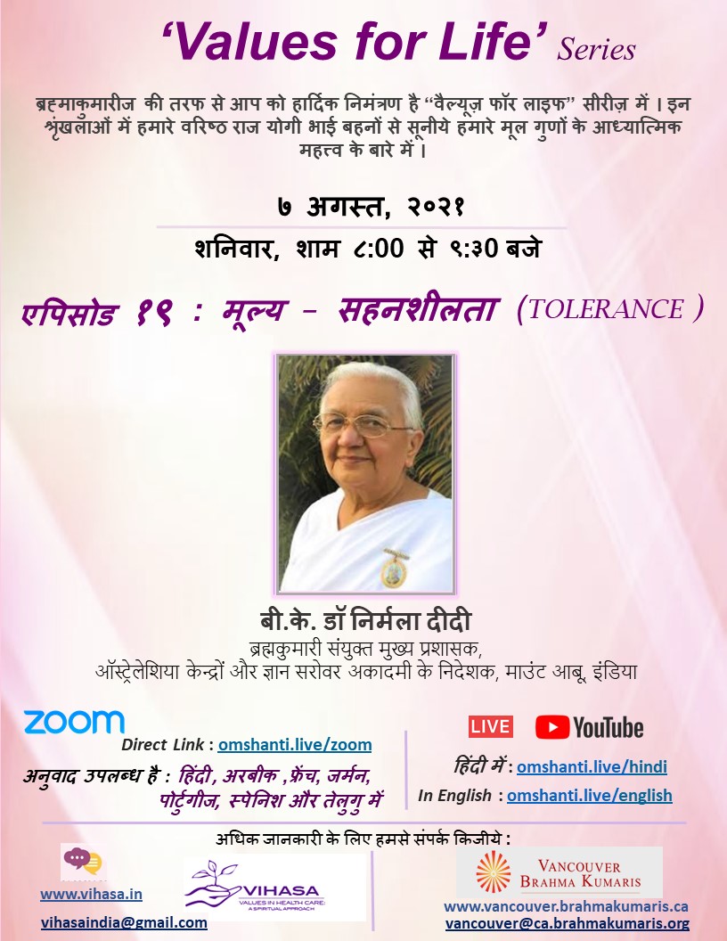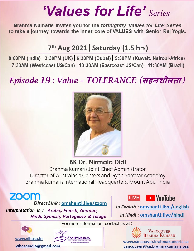 We extend our warm invitation for Episode # 19 of our fortnightly 'Values for Life' Series, with BK Dr. Nirmala Didi, for a spiritual reflection on “TOLERANCE”.