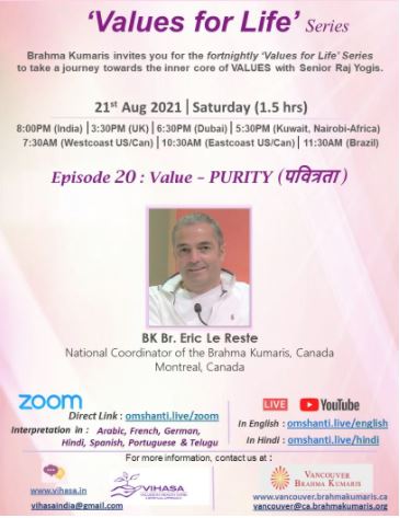 We extend our warm invitation for Episode # 20 of our fortnightly 'Values for Life' Series, with BK Brother Eric Le Reste, for a spiritual reflection on “PURITY”.