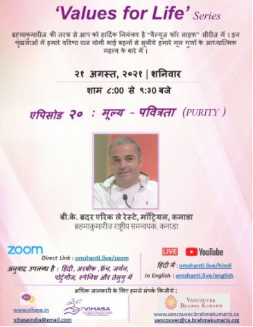 आप को हमारा हार्दिक निमंत्रण है ‘ Values for Life’ Series के एपिसोड २० में, २१ अगस्त को शाम ८:00 बजे । जिसमें हमारे साथ जुड़ेंगे बी.के. ब्रदर एरिक ले रेस्टे, मॉट्रियल, कनाडा से और हमसे आध्यात्मिक मूल्य - “ पवित्रता ” के महत्व पर चर्चा करेंगे।