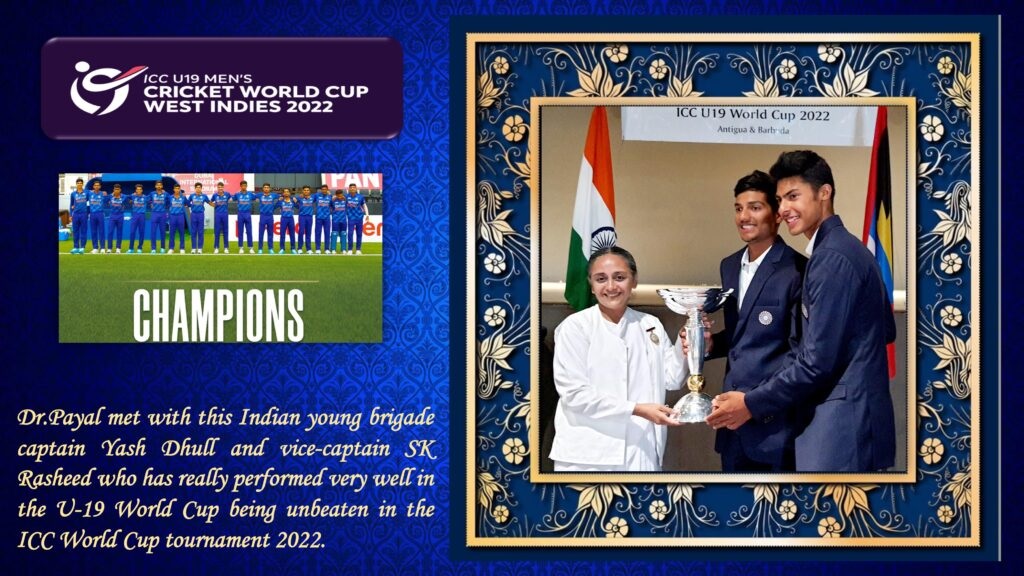 Dr Payal met with this Indian young brigade who has really performed very well in the U-19 World Cup being unbeaten in the tournament. She was also invited to witness the final match of this historic world cup earlier in the day held at the Sir Vivian Richards Cricket Stadium where the young Team India was victorious against the England team.
