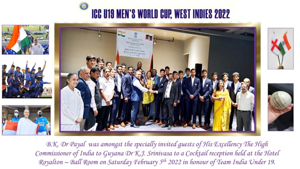 Antigua and Barbuda, Caribbean (North America) : BK Dr Payal was invited as special guests by His Excellency The High Commissioner of India in Antigua and Barbuda Dr K.J. Srinivasa and Mrs Ashwini G.S to a Cocktail reception held at the Hotel Royalton – Ball Room in honor of Team India Under 19.