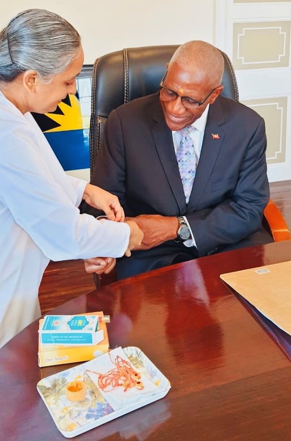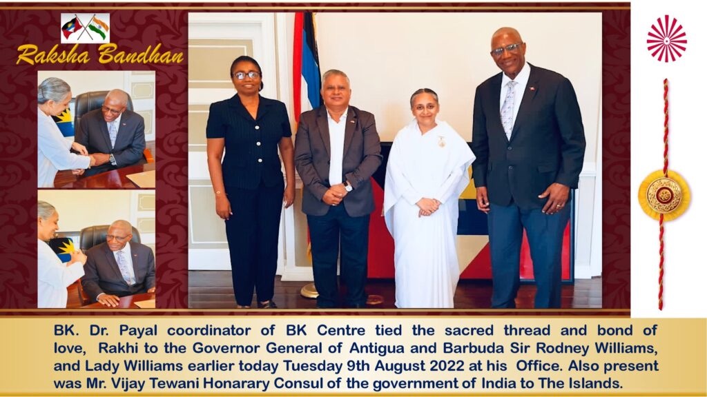 Antigua and Barbuda (Caribbean, America): I saw a Light entering the Office … a sparkle, my Guardian Angel. I can feel the Purity and Spiritual vibrations. This is how Acting Prime Minister, Minister of Justice, and Attorney General of Antigua and Barbuda Hon Mr. Steadroy “Cutty” Benjamin described BK Dr. Payal who visited him yesterday August 11th, 2022, to give Good Wishes and convey God’s Blessings and tie Rakhi to him.