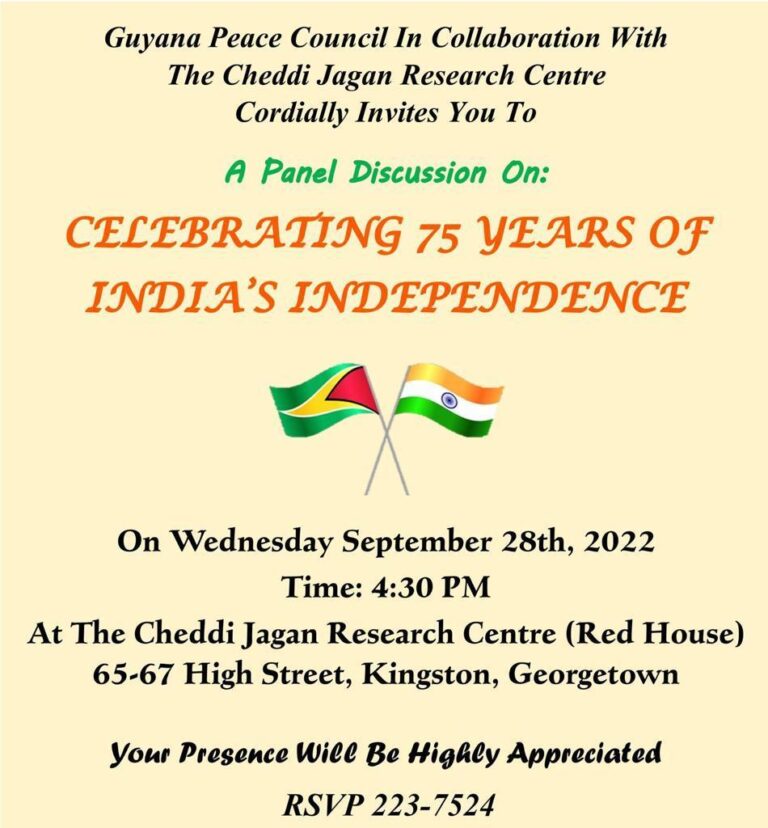 Georgetown, Guyana (South America): Guyana Peace Council held a panel discussion on Celebrating 75 years of India’s Independence held at the Red House in Kingston, Georgetown.