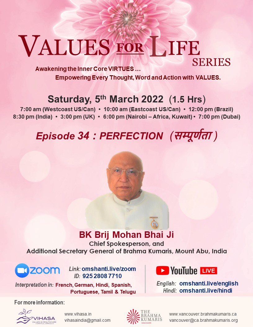 1) Join us for our fortnightly 'Values for Life' Series Episode #34 , with BK Brij Mohan Bhai Ji from India, for a spiritual reflection on “PERFECTION.”