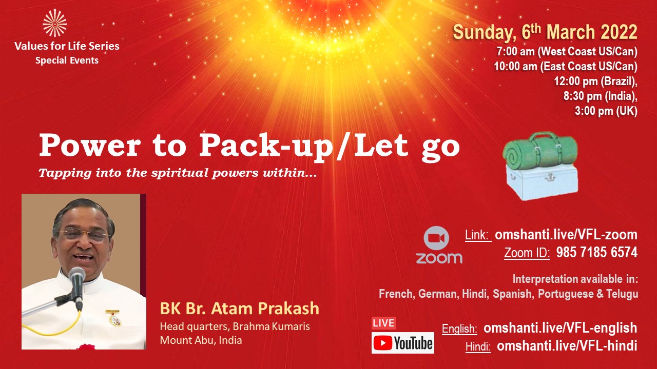 We warmly welcome you for the following two 'Values for Life' - programs this weekend : Session on 'Perfection' on Saturday at 7 AM, and 'Power to Pack up / Let go' on Sunday at 7 AM.