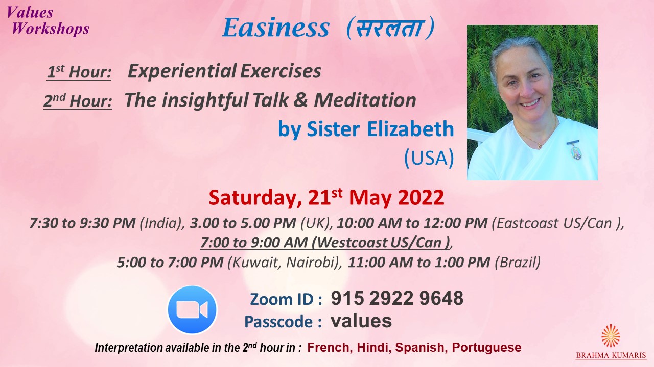 Join us this Saturday for our fortnightly Experiential Values Workshops - Series : this time on "Easiness."