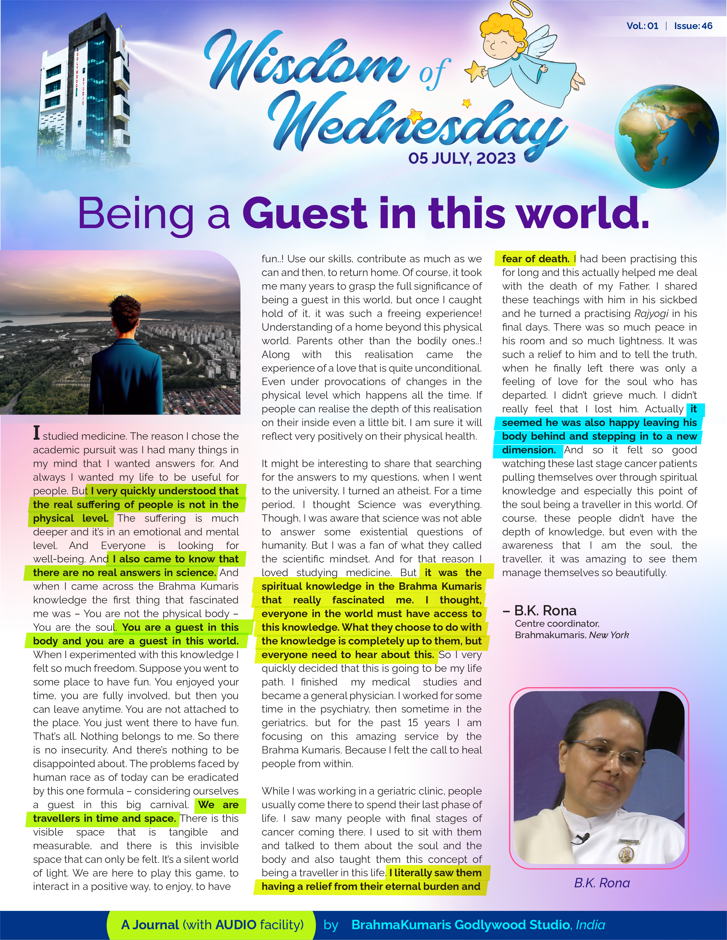 But you will look at this in a different light after you read this account by BK Rona of New York, who tried to grasp the essence of this profound line - We are travellers in this world, backed up by the spiritual knowledge and she saw how people were able to relieve thir sufferings by living the essence of this seemingly simple wisdom!