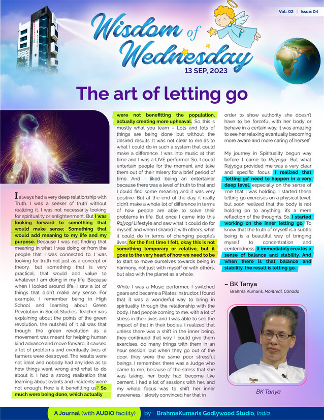 Stress in life negatively affects a lot of areas in our life. Changes in the body is a visible proclaimer of stress. To relieve stress, it is necessary to make changes in our inner awareness and ultimately learn to let go. Read an account on today's issue of Wisdom of Wednesday how a young energetic and talented Sis. Tantya from Montreal searched for the truth and ultimately found her own method to let go.