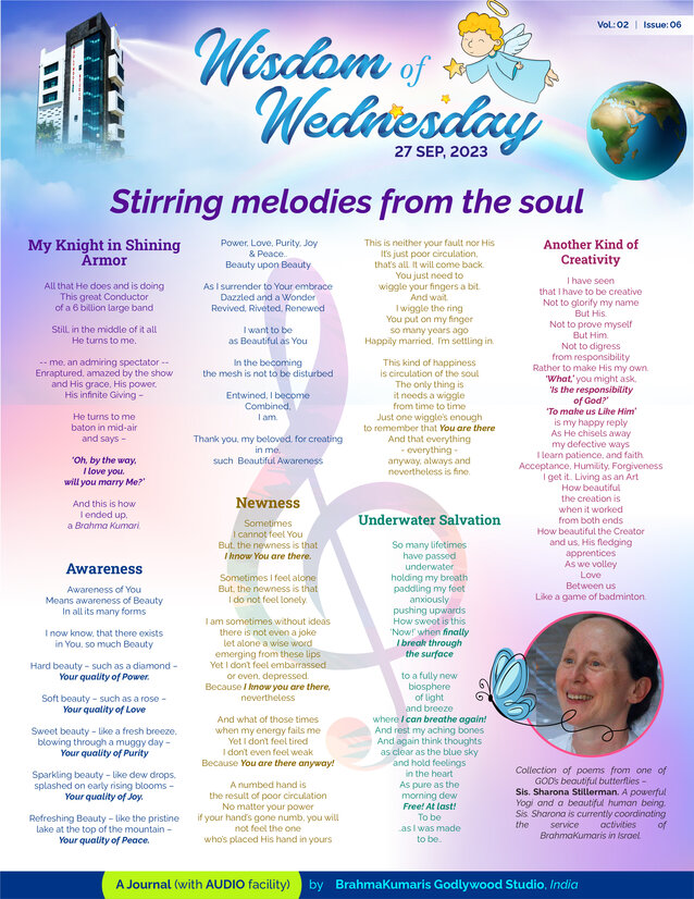 These poems are from Sis. Sharona Stillerman,currently coordinating the service of Brahma Kumaris in Israel, a deep Yogi and a wonderful human being who found her life's mission of helping humanity find it's inner beauty, who in her own words is not a poet, but a butterfly, who with the help of GOD has tasted the nectar of life.