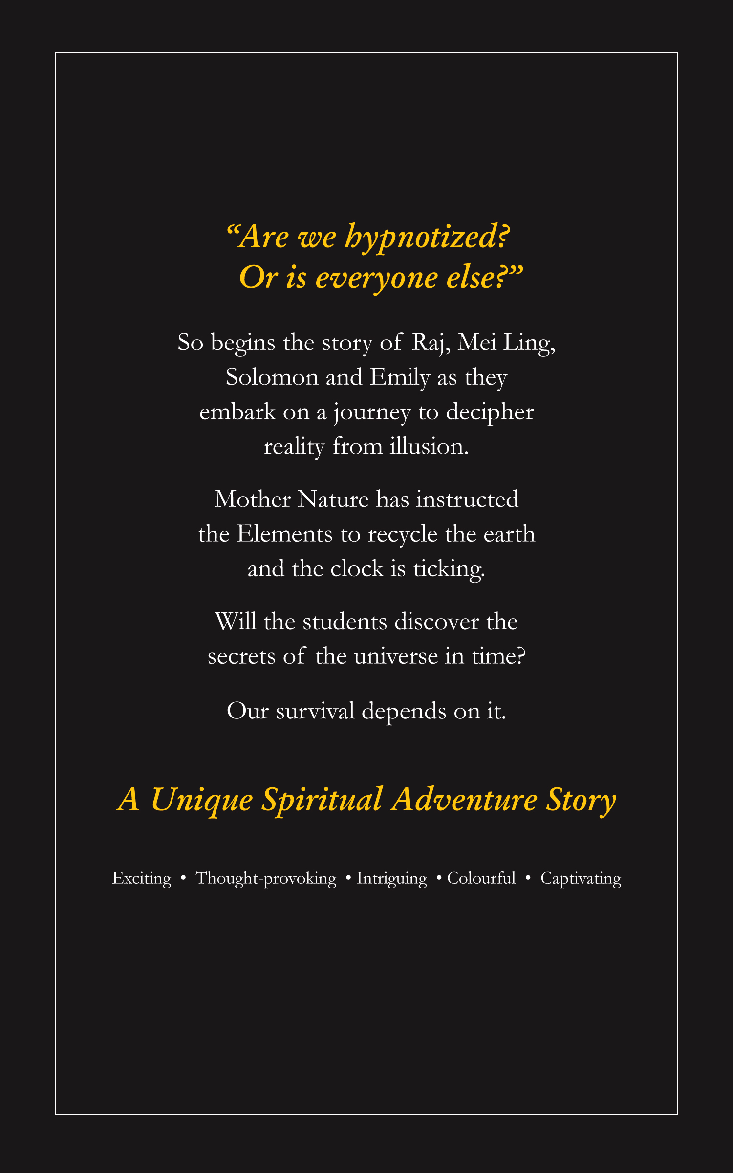 | Johnson, J., Morgan, R., Morgan, L. (2014) Mei Ling, Raj, Emily and Solomon have no idea why they have been selected for this assignment. Together they must learn to trust each other and decipher truth from illusion in search of the seven secrets of the universe. Mother Nature is finally ready to regenerate the planet, tired of human misuse and abuse. Human beings will join the regeneration process only if these four International School students are able to discover the Seven Secrets in time. A master of illusion will do everything in her power to stop them with obstacles - both inner and outer. Beijing is the setting for this adventure of the spirit.